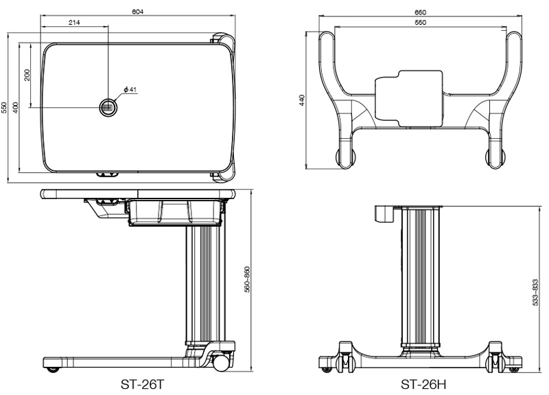The large underfoot space of ST-26 allows a patient in a wheelchair to be examined quickly and comfortably. ST-26T with a T-shaped base has its column at the side of the table.