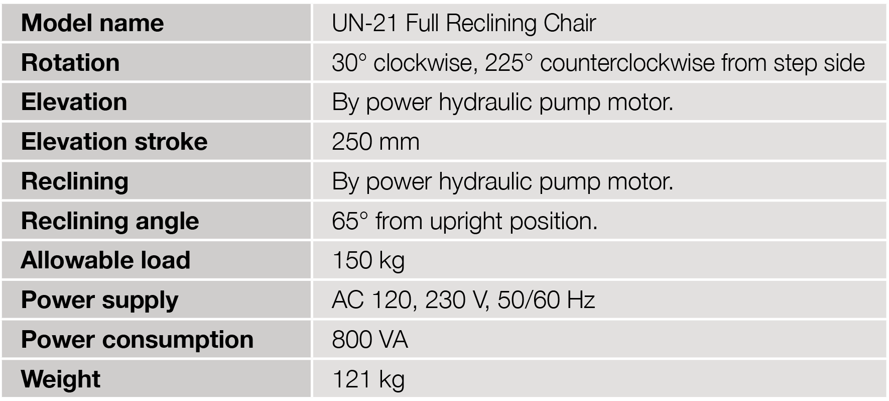 A standard foot switch controls lifting/lowering, back/forward tilting, and stopping positions of the chair.